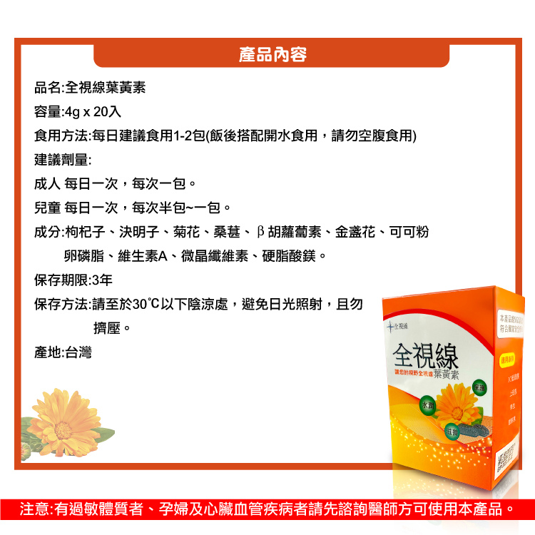 特別是年過45以上的熟齡男女性朋友,要特別注意此時容易面臨到工作壓力與健康壓力,40歲~50歲是面臨到夫妻感情相處及工作壓力,50歲開始會面臨父母與疾病給的身心壓力,而全視線葉黃素是MIT台灣生產並通過SGS檢驗符合國家安全標準出品,非常適合3C低頭族、上班族、學生、銀髮族食用,好好守護自己最重要的靈魂之窗,如果是感覺已經不再年輕的上班族可以每天食用一次,每次一包。兒童每日建議食用一次,每次半包~一包。多食無益!