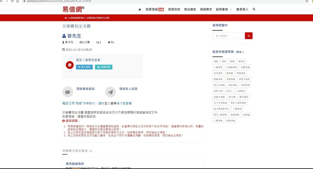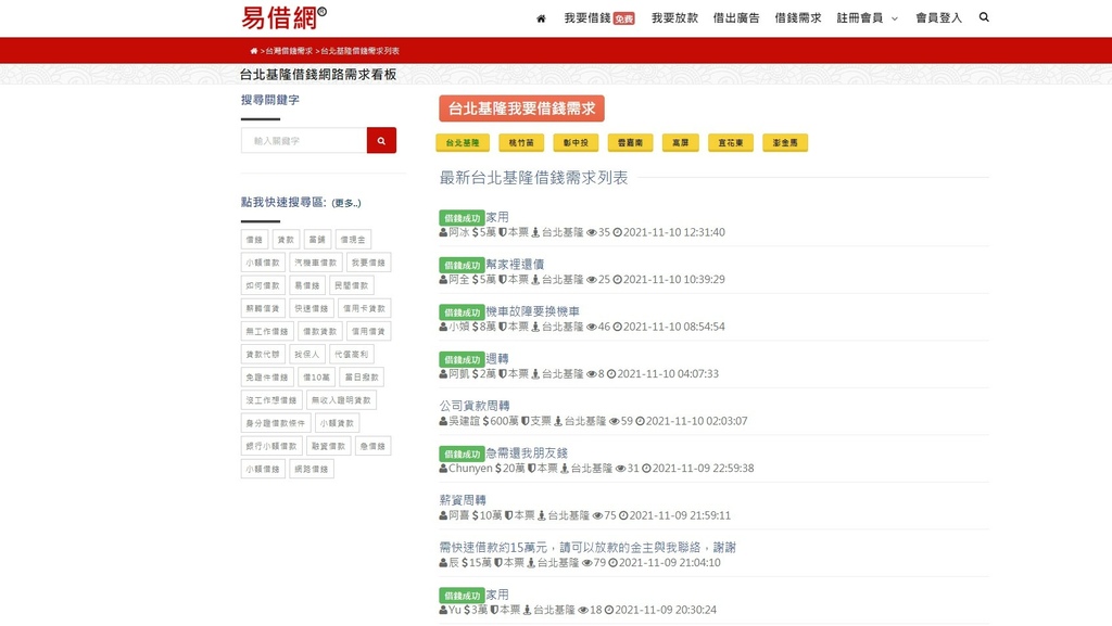 如果是想要借錢的人,可以註冊會員並選擇自己所在的區域,張貼自己為什麼要借錢的理由及資訊,同時盡量詳盡寫清楚,各類借錢的案件多到讓人眼花撩亂,可見得「莫忘世上苦人多」,有些人借錢是因為做小本生意,產業受到人潮變少的衝擊,處於沒人來的缺錢狀態,小孩又要繳學費、房租、奶粉錢,現在物價樣樣上漲,老闆與主管又刻意刁難不排有小孩的員工班表,計算機算下來月薪根本不到一萬六千元左右,有些人家裡有兩個小孩還在念書,還有房租要繳,實在不堪這種收入低的打擊,「易借網」就不失為籌錢應急的好方法。